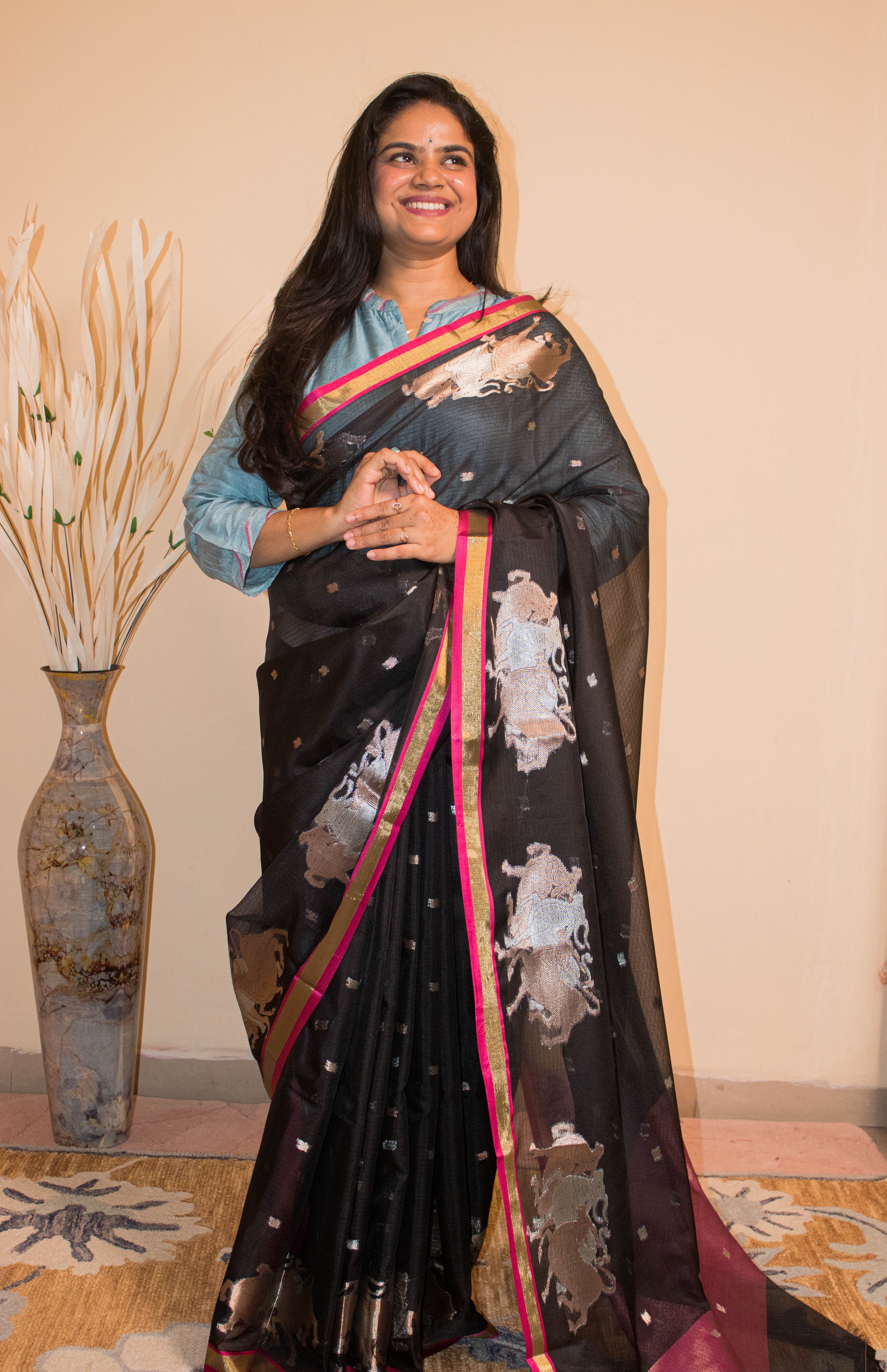 Banarasi Cotton Silk Fabric Nandi Weaved Motifs Golden Silver Weaving - Black