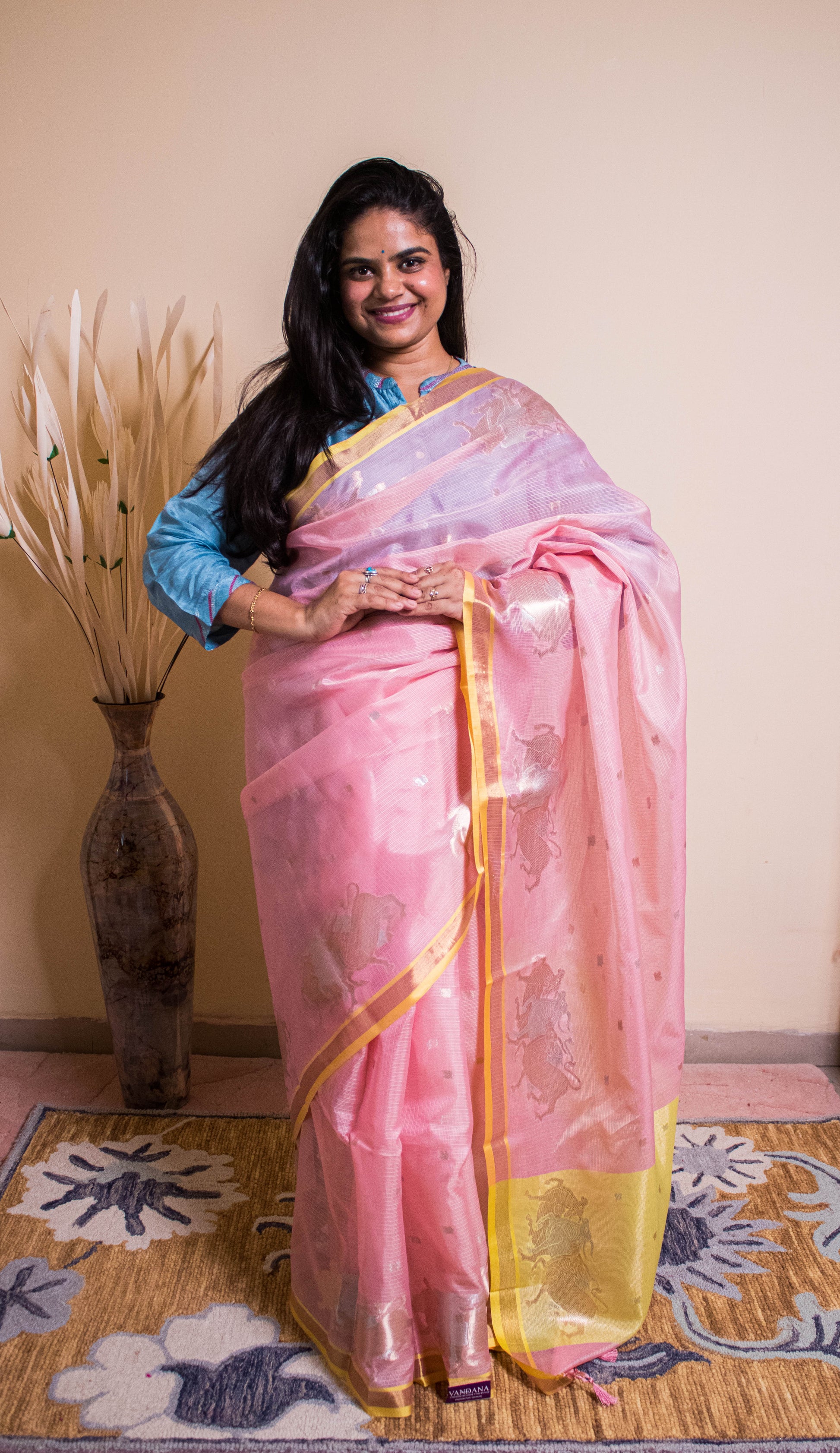 Banarasi Cotton Silk Fabric Nandi Weaved Motifs Golden Silver Weaving - Pink