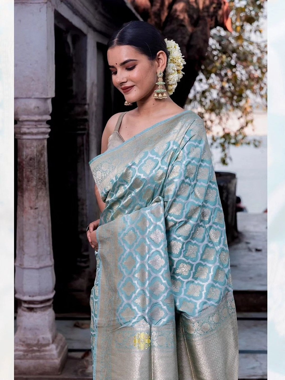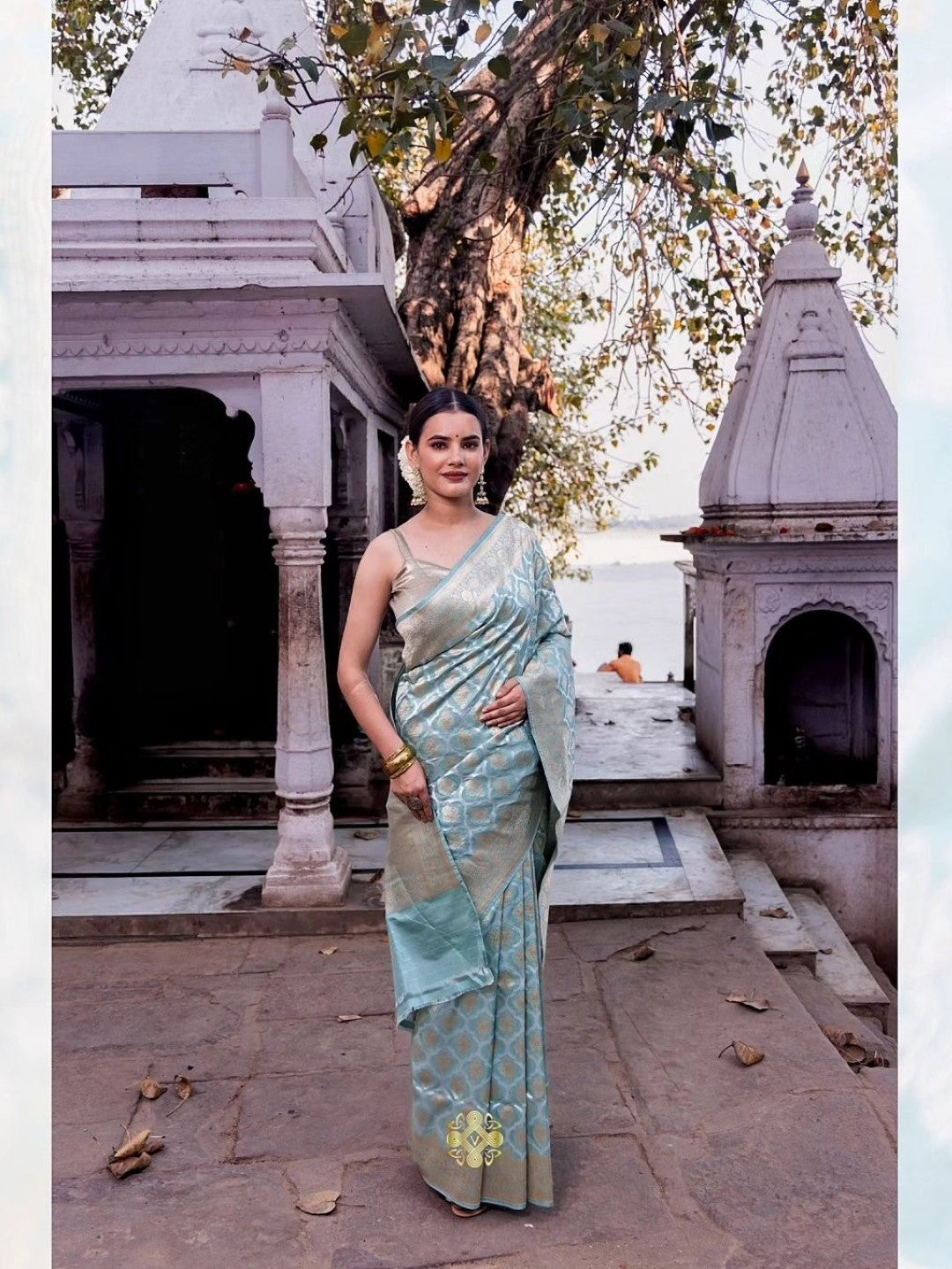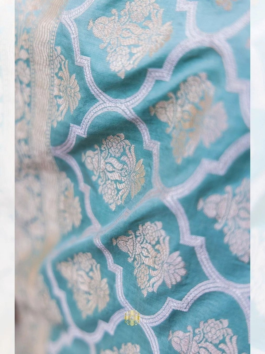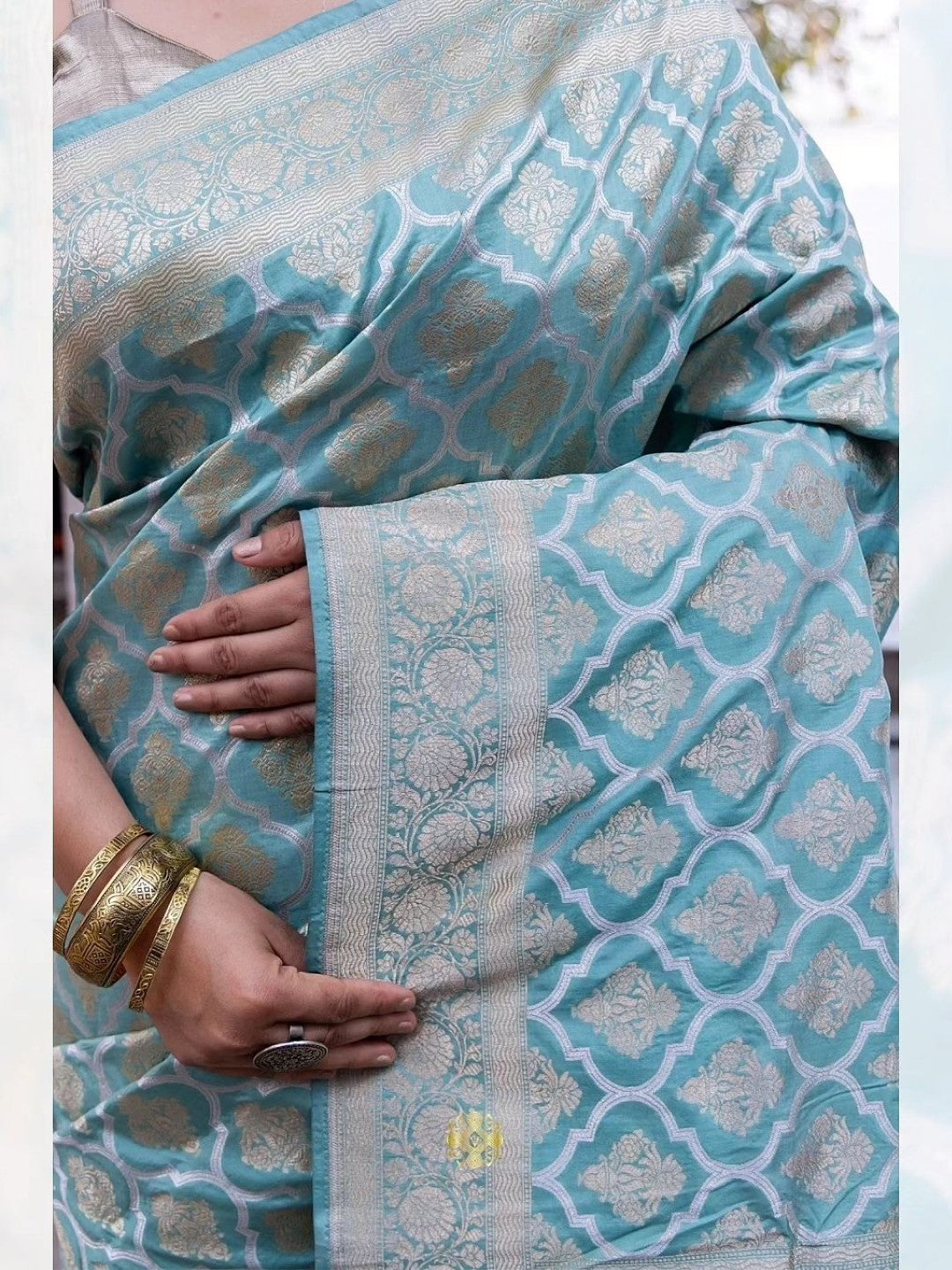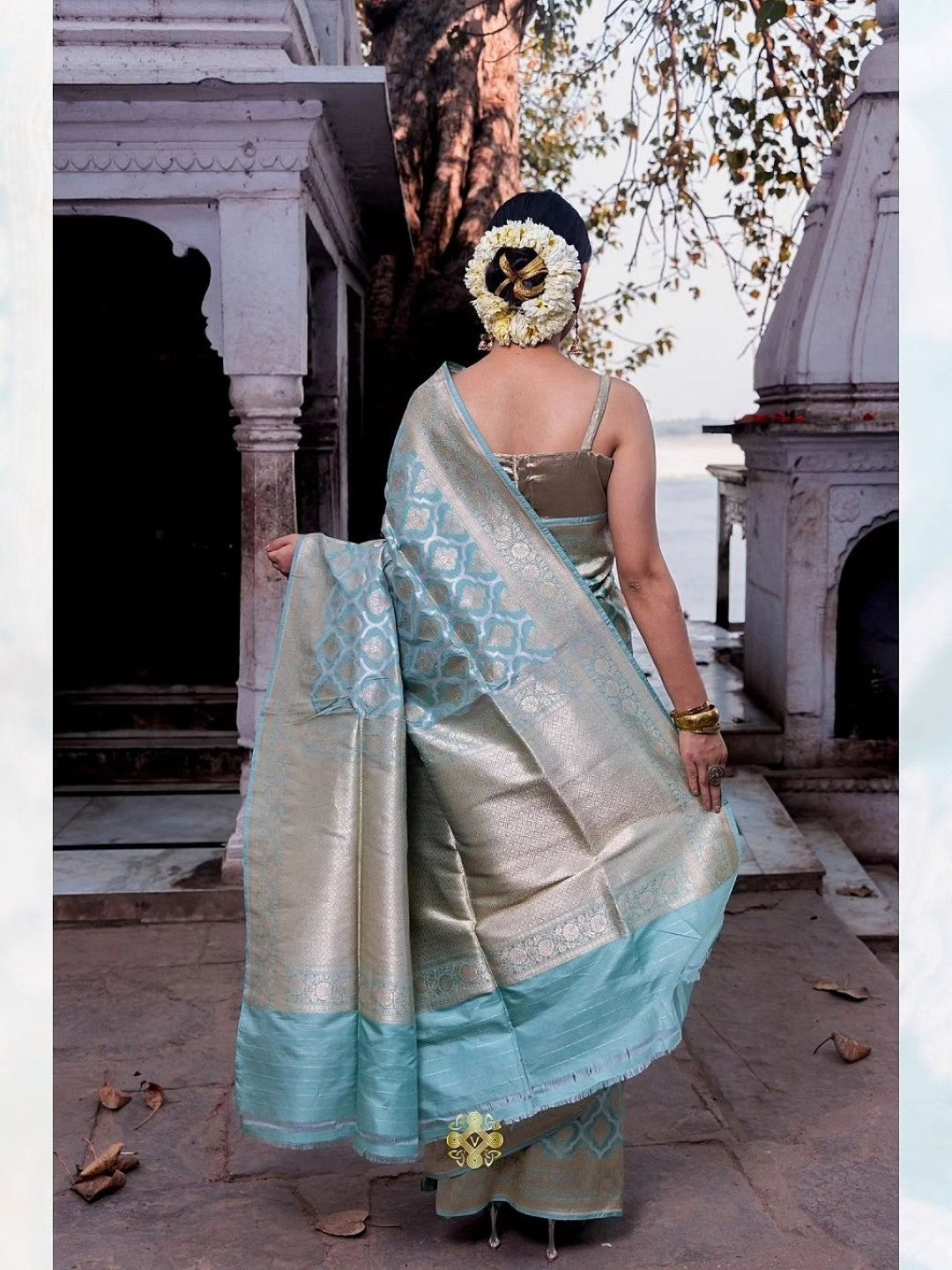 Embrace elegance with this Pure Katan Silk BS in a rich blue hue. Handwoven in Banaras, it features a luxurious silk texture and intricate craftsmanship, perfect for weddings and special occasions. The smooth drape and vibrant color make it a timeless addition to your wardrobe.