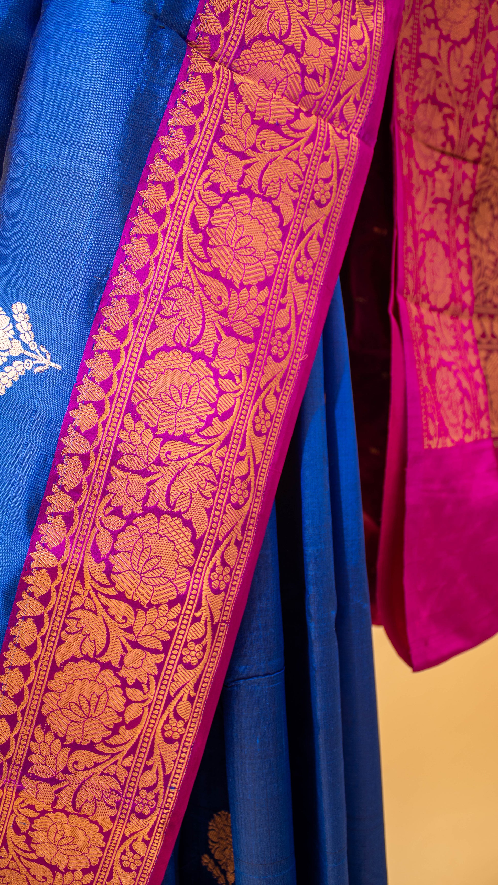 Handloom Banarasi Contrast Border And Butti Design-Blue