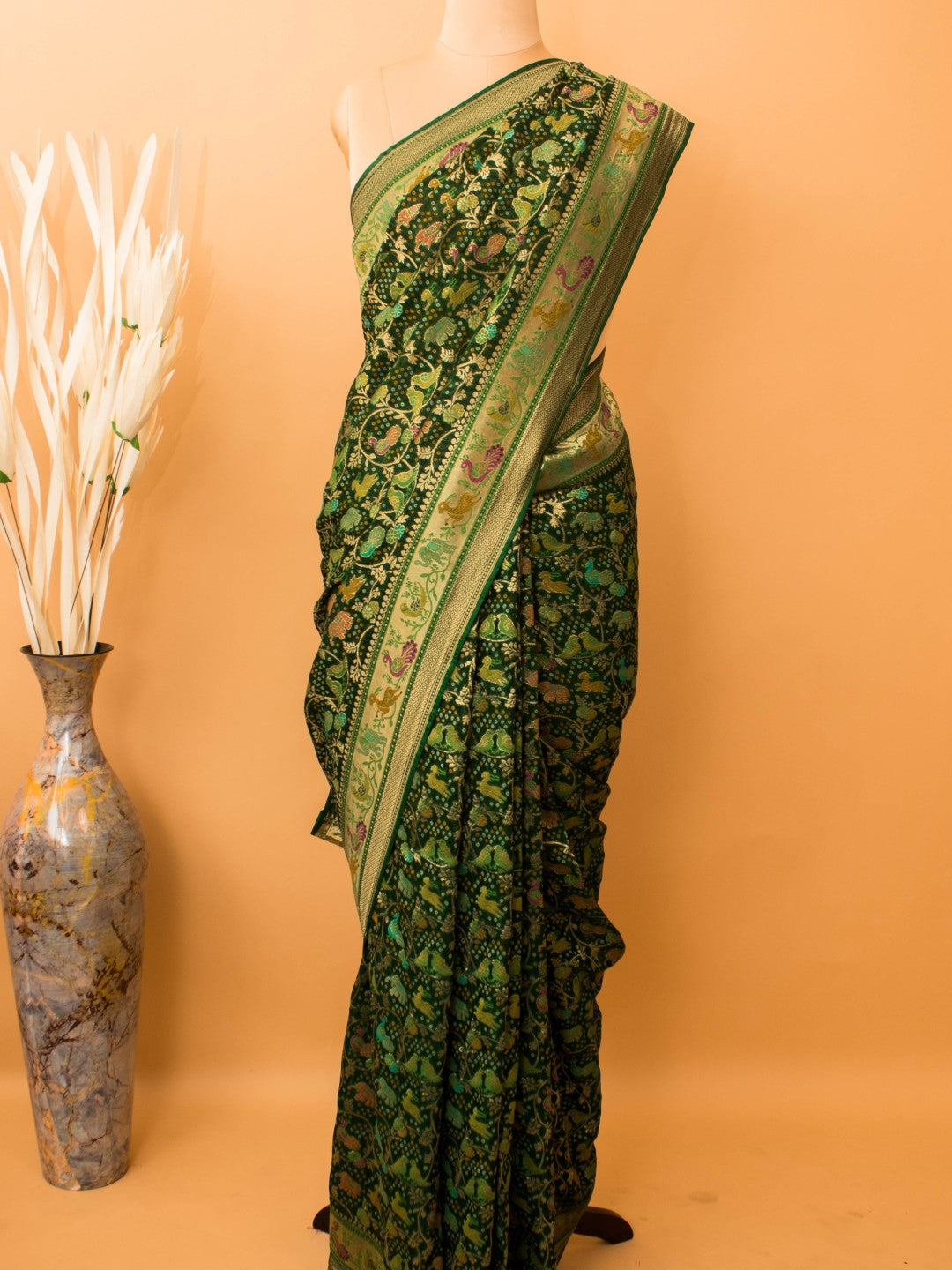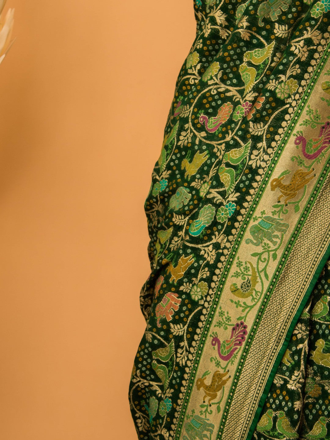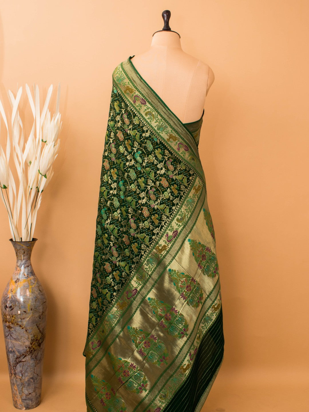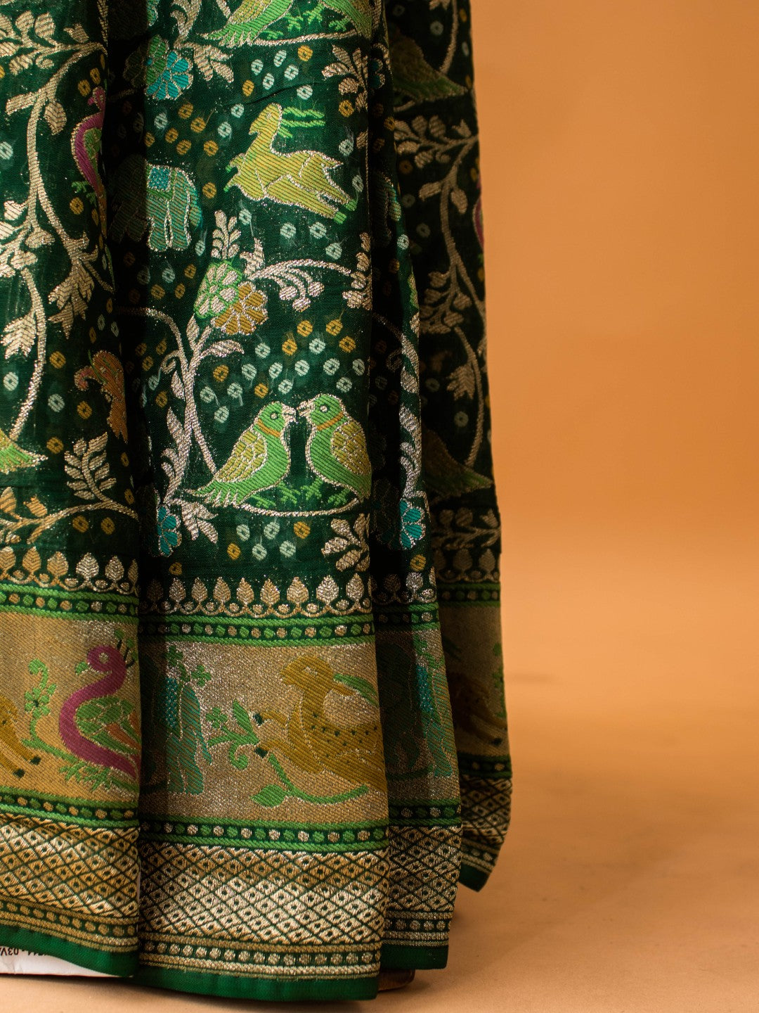 Khaddi Bandhej With Meenakari Shikargha Saree - Green