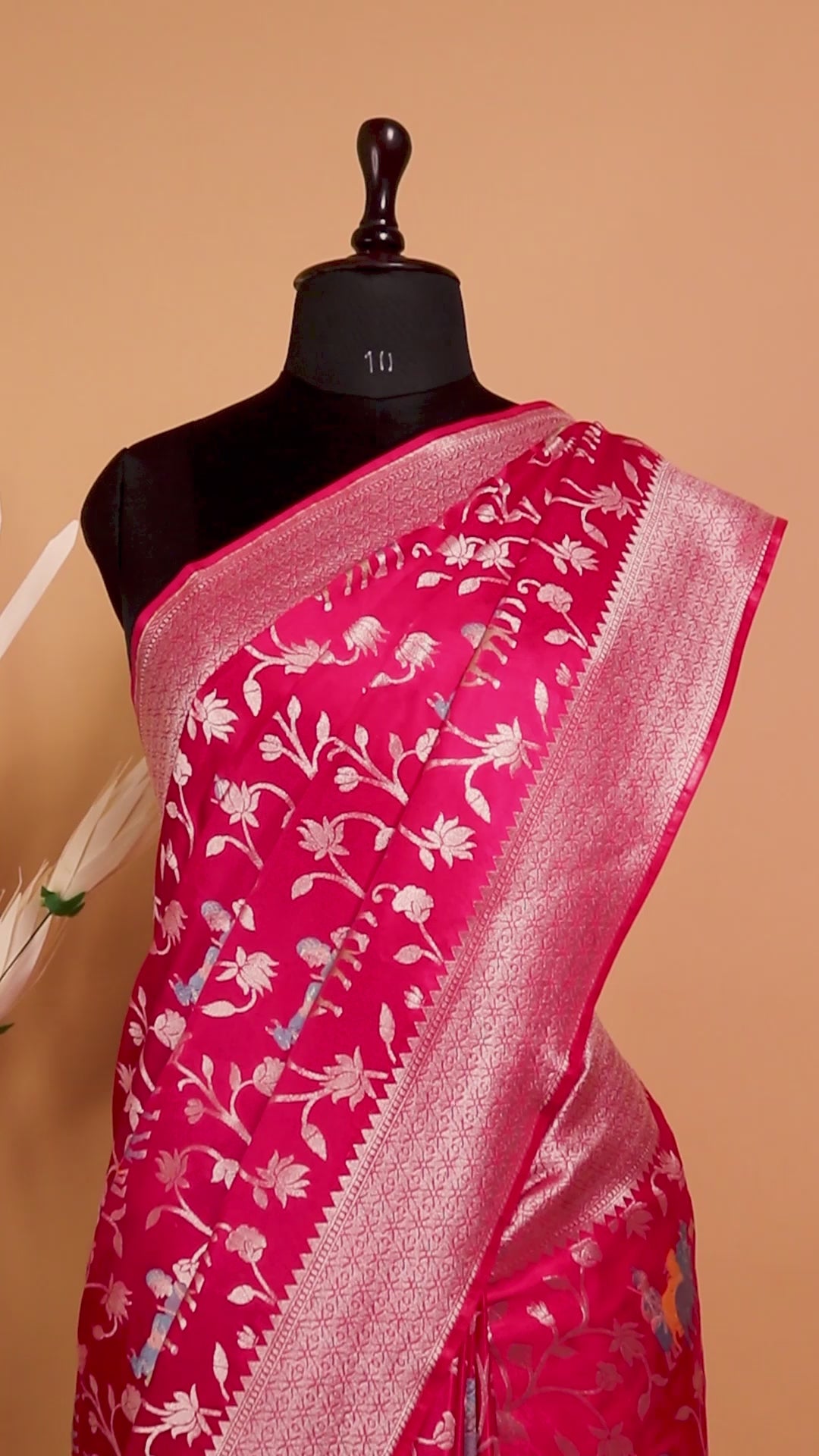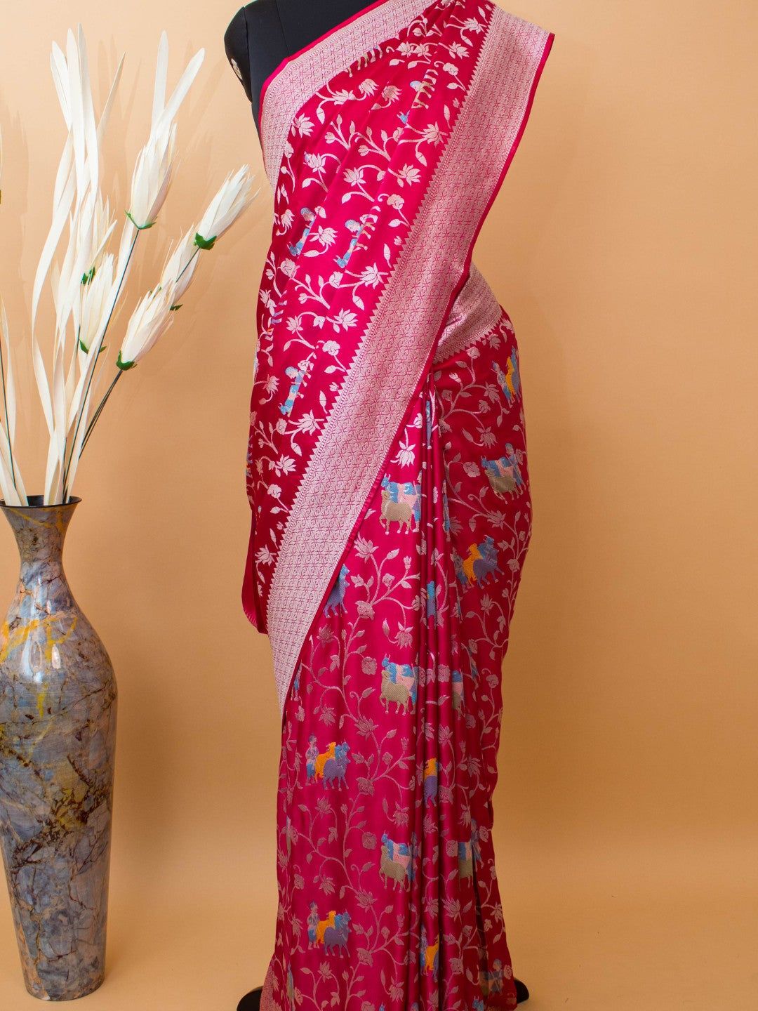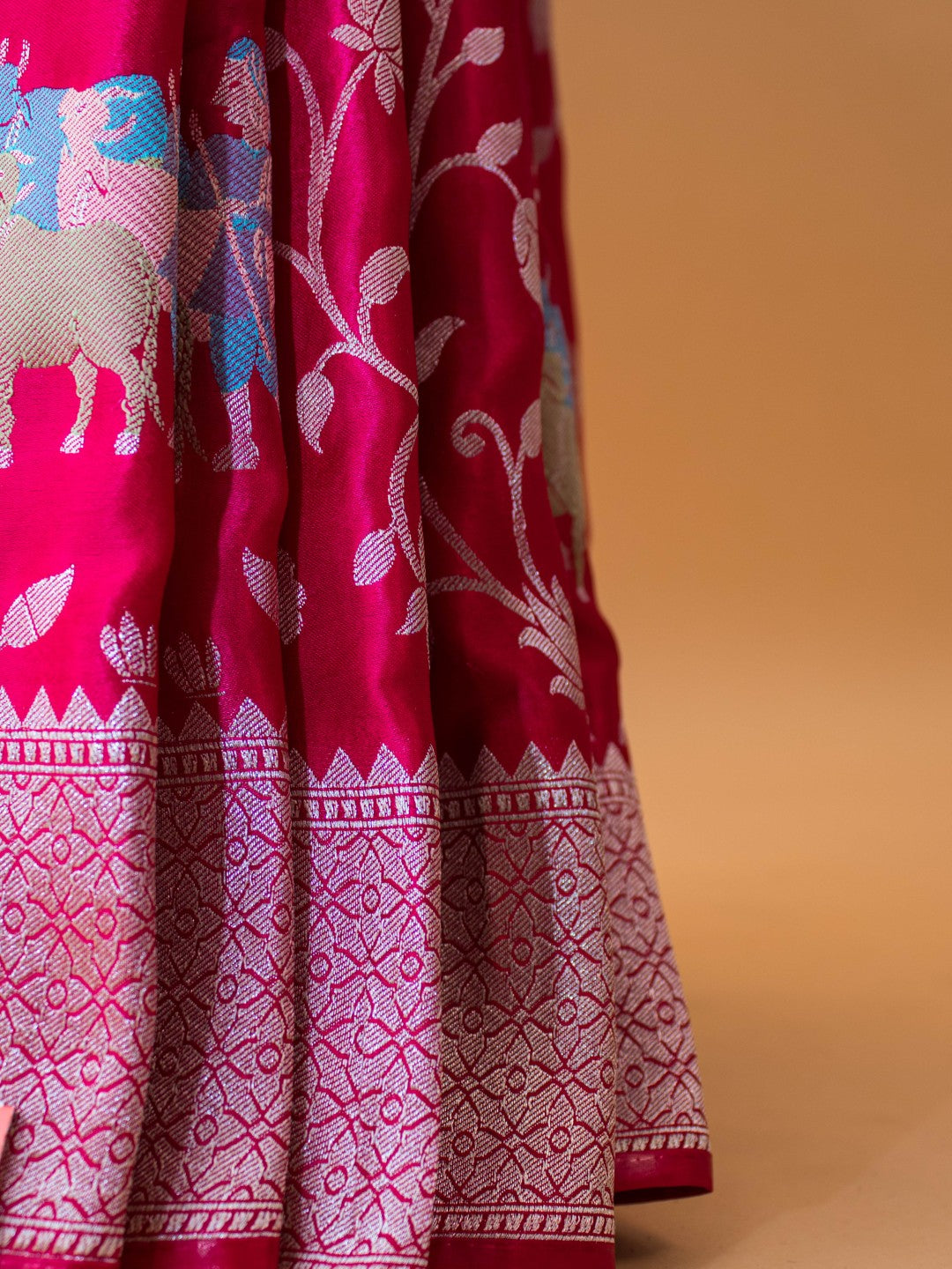 Celebrate heritage storytelling with this enchanting Mashru Silk Saree, featuring intricate jaal weaving that depicts a serene cow grazing story. The smooth sheen of Mashru and narrative motifs make it a standout choice for festive gatherings, weddings, and cultural events.