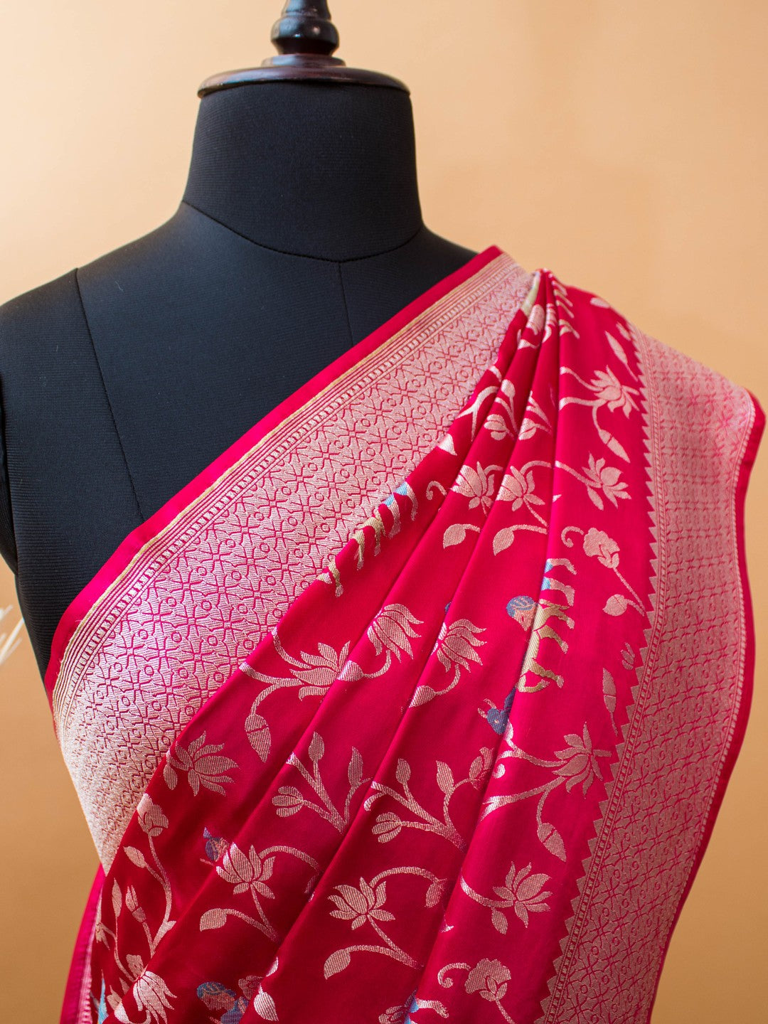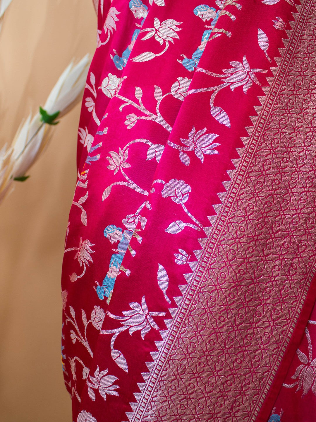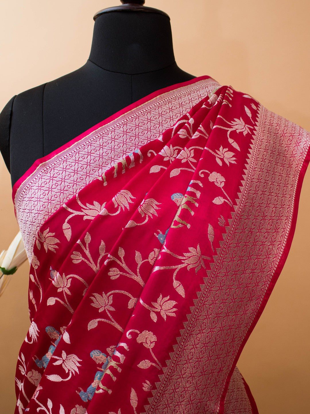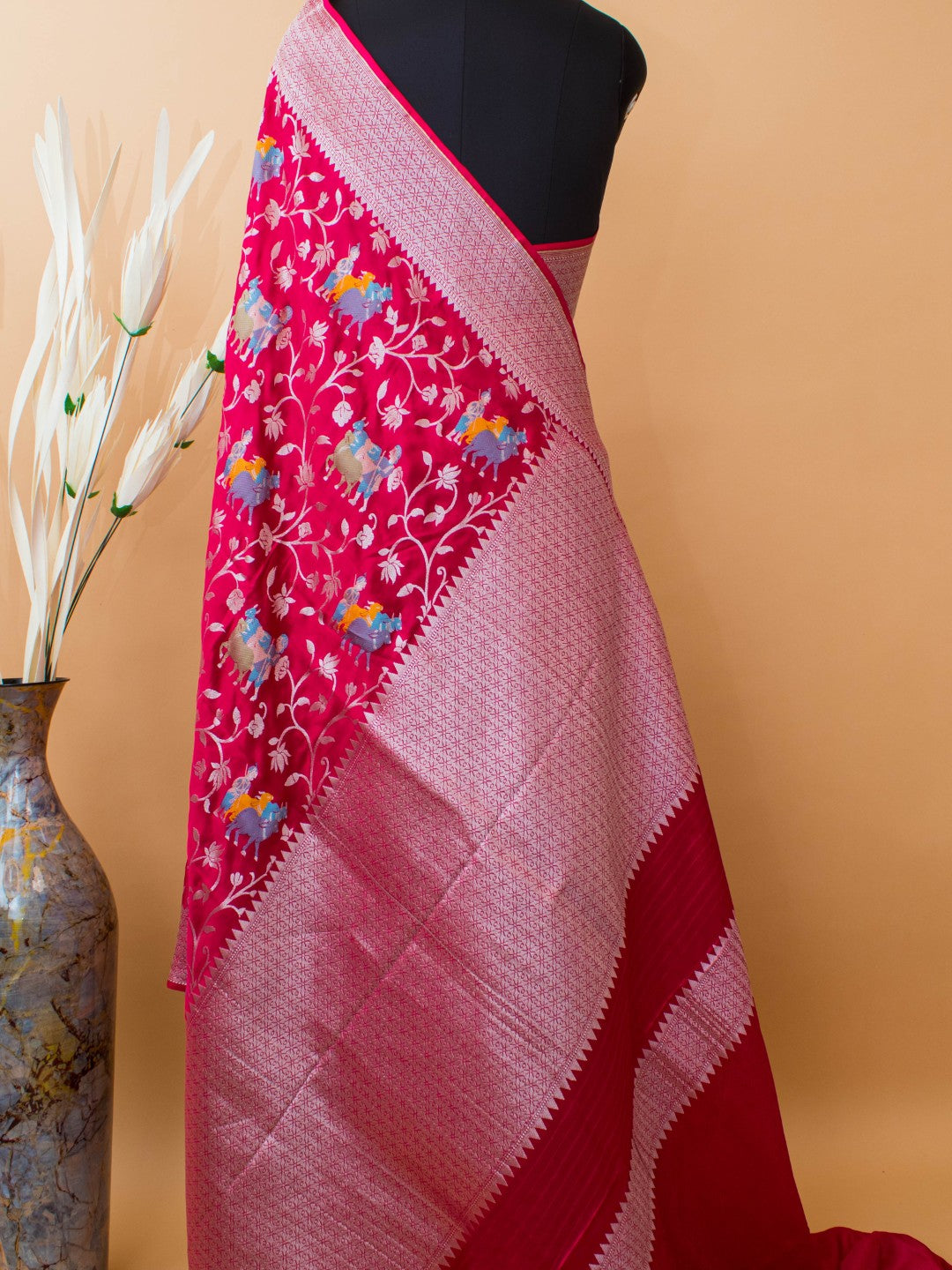 Celebrate heritage storytelling with this enchanting Mashru Silk Saree, featuring intricate jaal weaving that depicts a serene cow grazing story. The smooth sheen of Mashru and narrative motifs make it a standout choice for festive gatherings, weddings, and cultural events.
