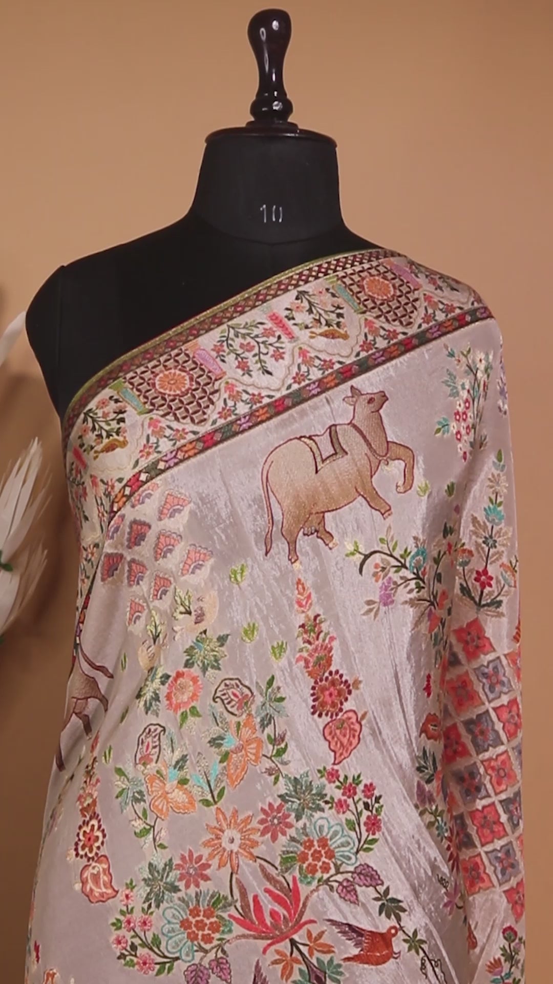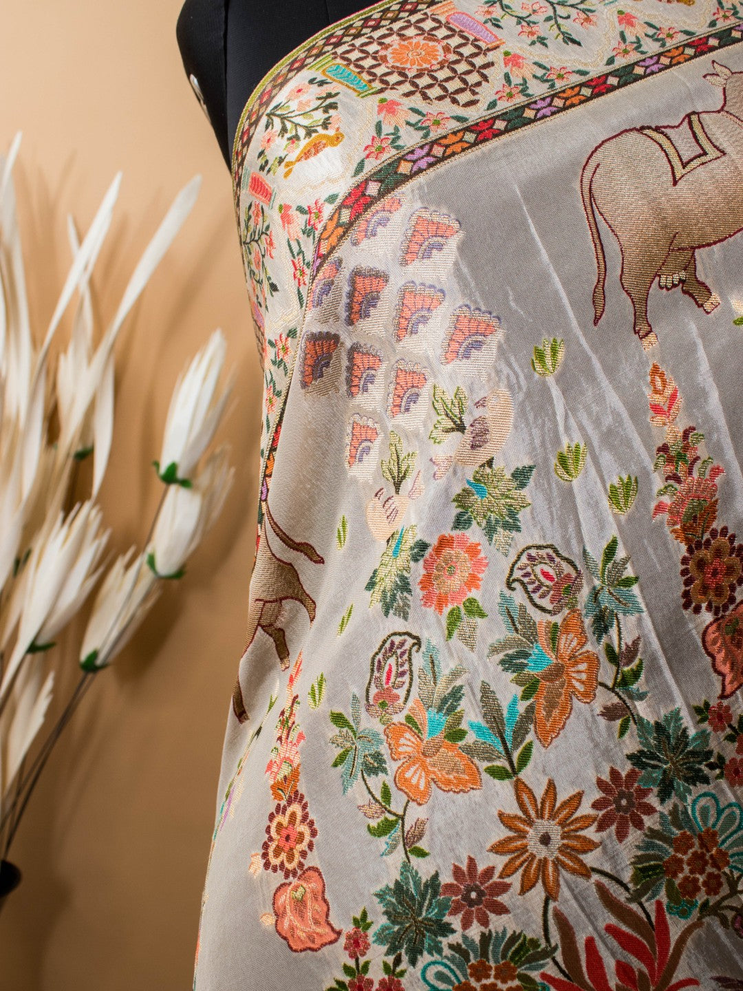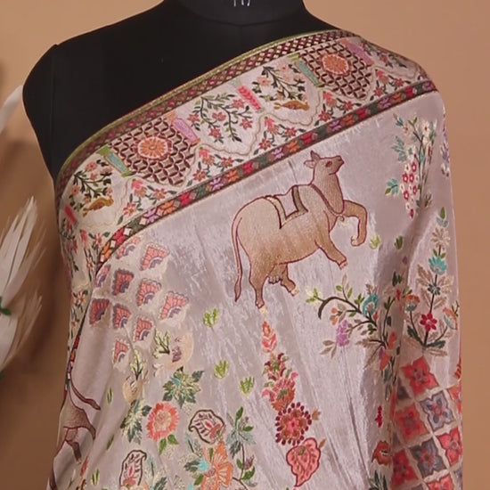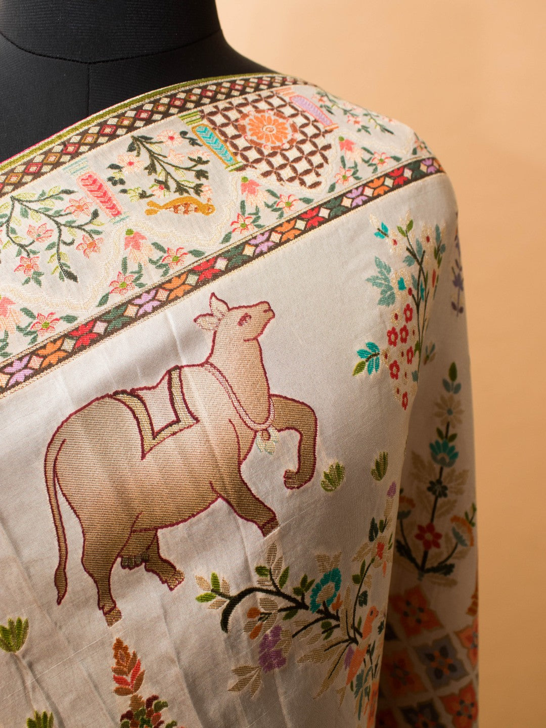 Meenakari Pichwai Weaving In Munga Silk -whte