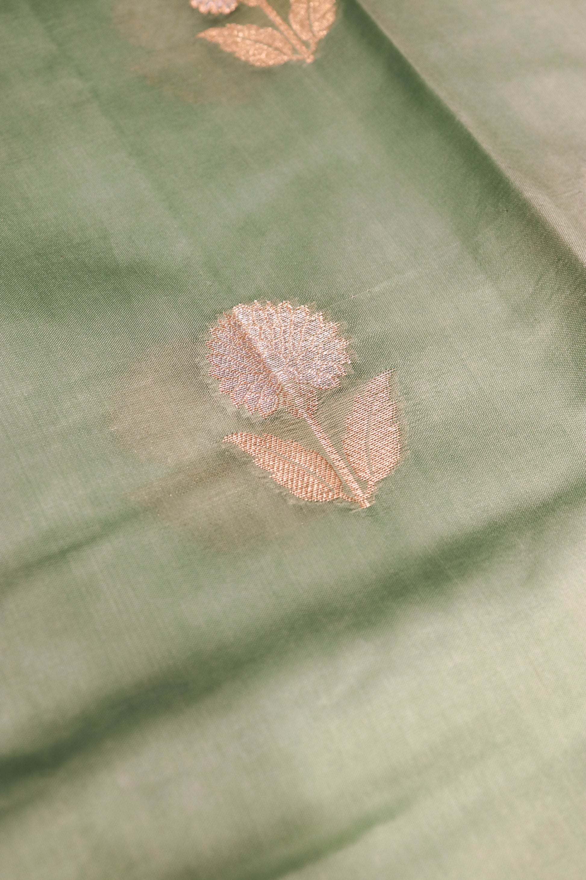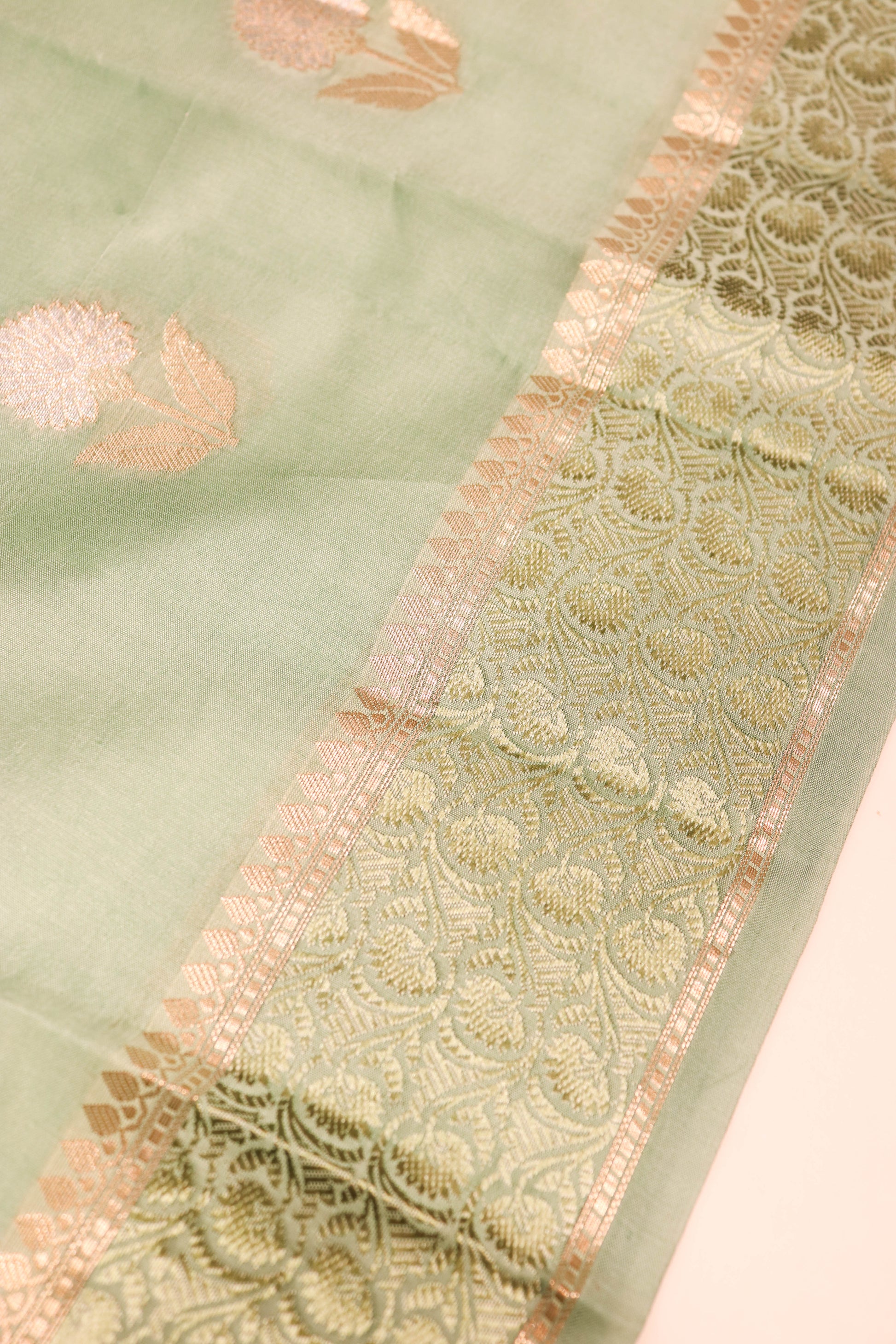 Resham Weaving Border And Silver And Gold Zari Motif In Pure Dupion Silk Green