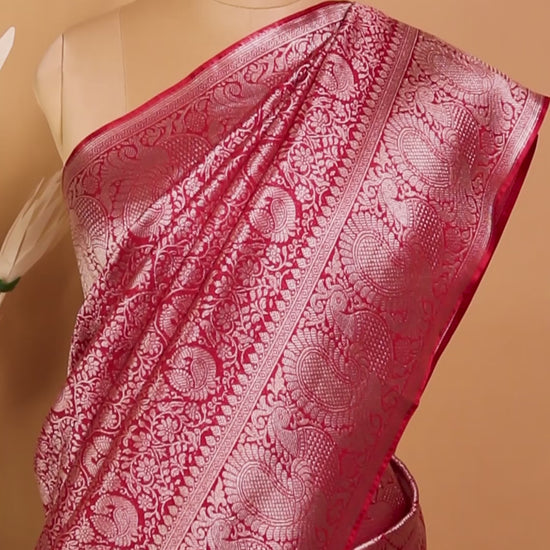 Indulge in understated luxury with this Soft Silk Saree, woven in elegant Tanchui Jamawar style. The charming pink hue and intricate patterning create a graceful silhouetteâ€â€ideal for weddings, festive gatherings, and traditional celebrations.