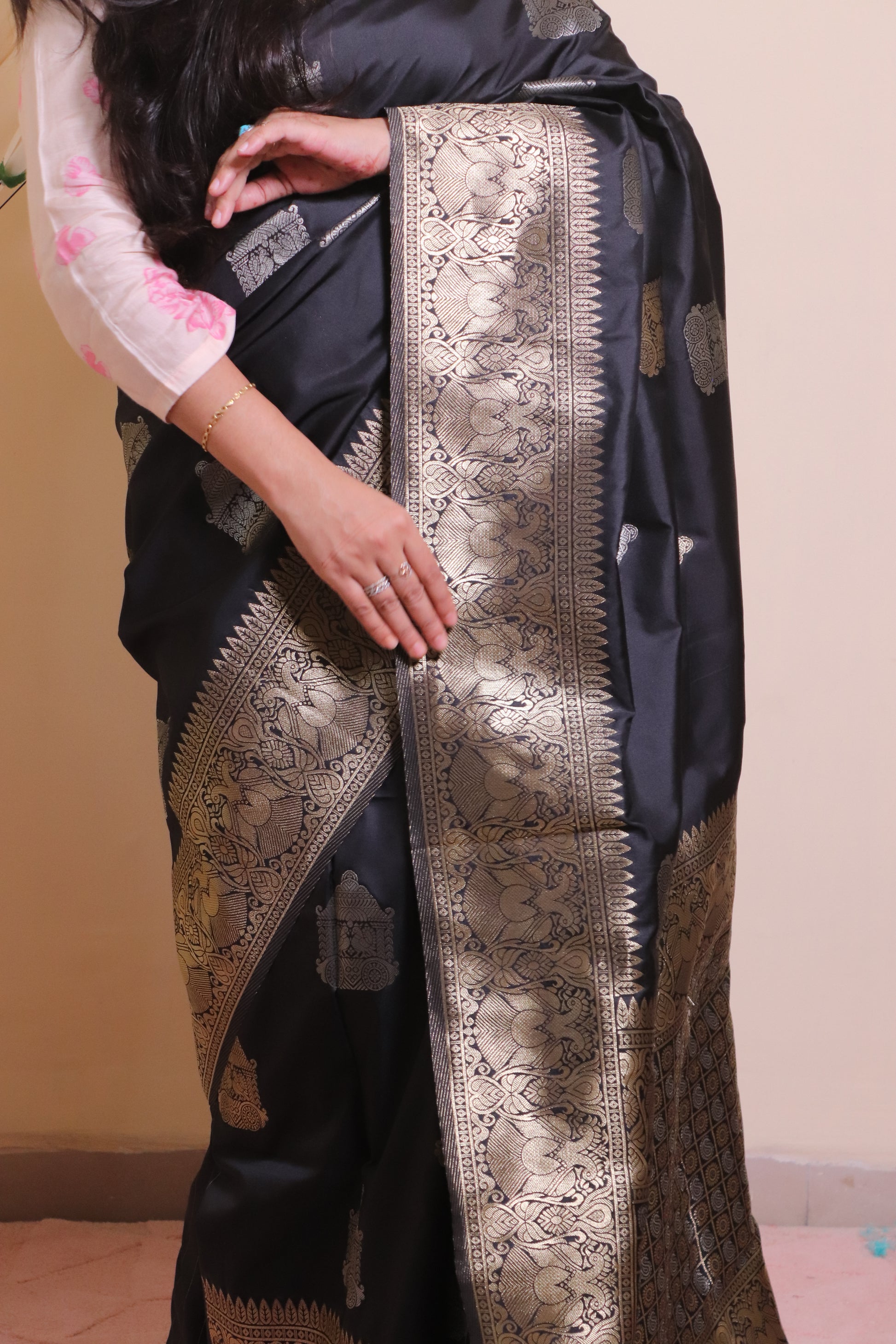 Soft Silk Weaved In Silver And Gold Zari - Black