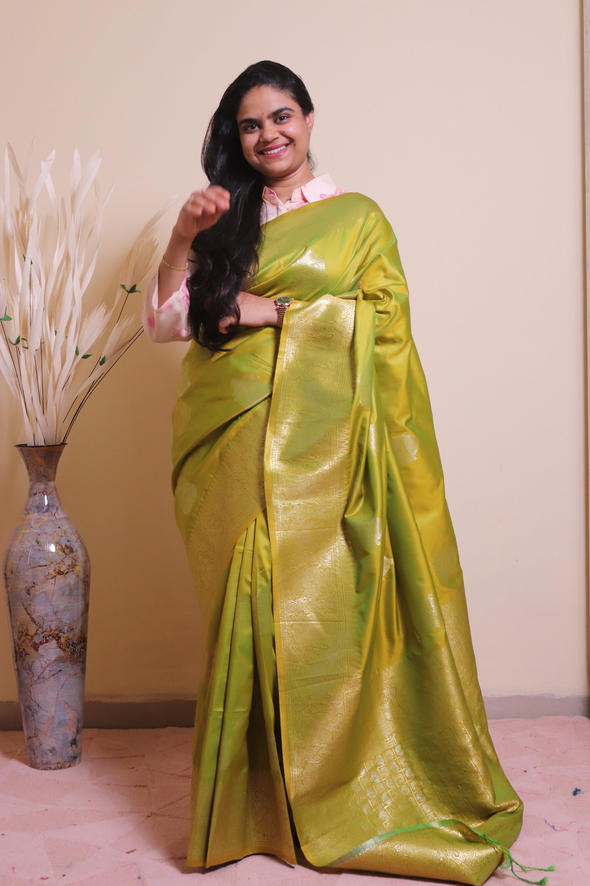 Soft Silk Weaved In Silver And Gold Zari - Green